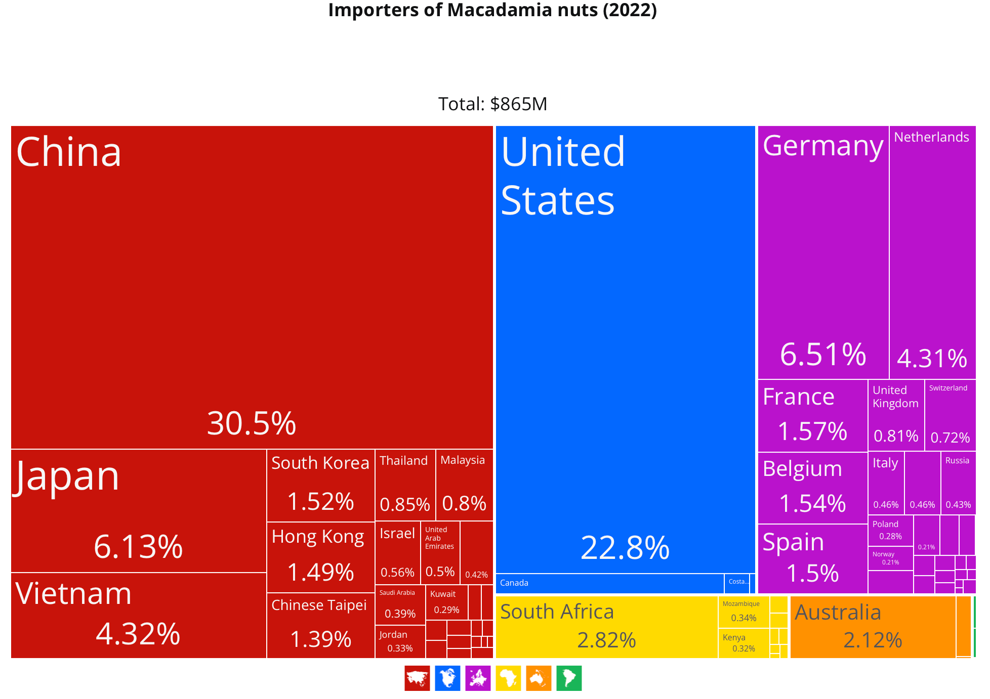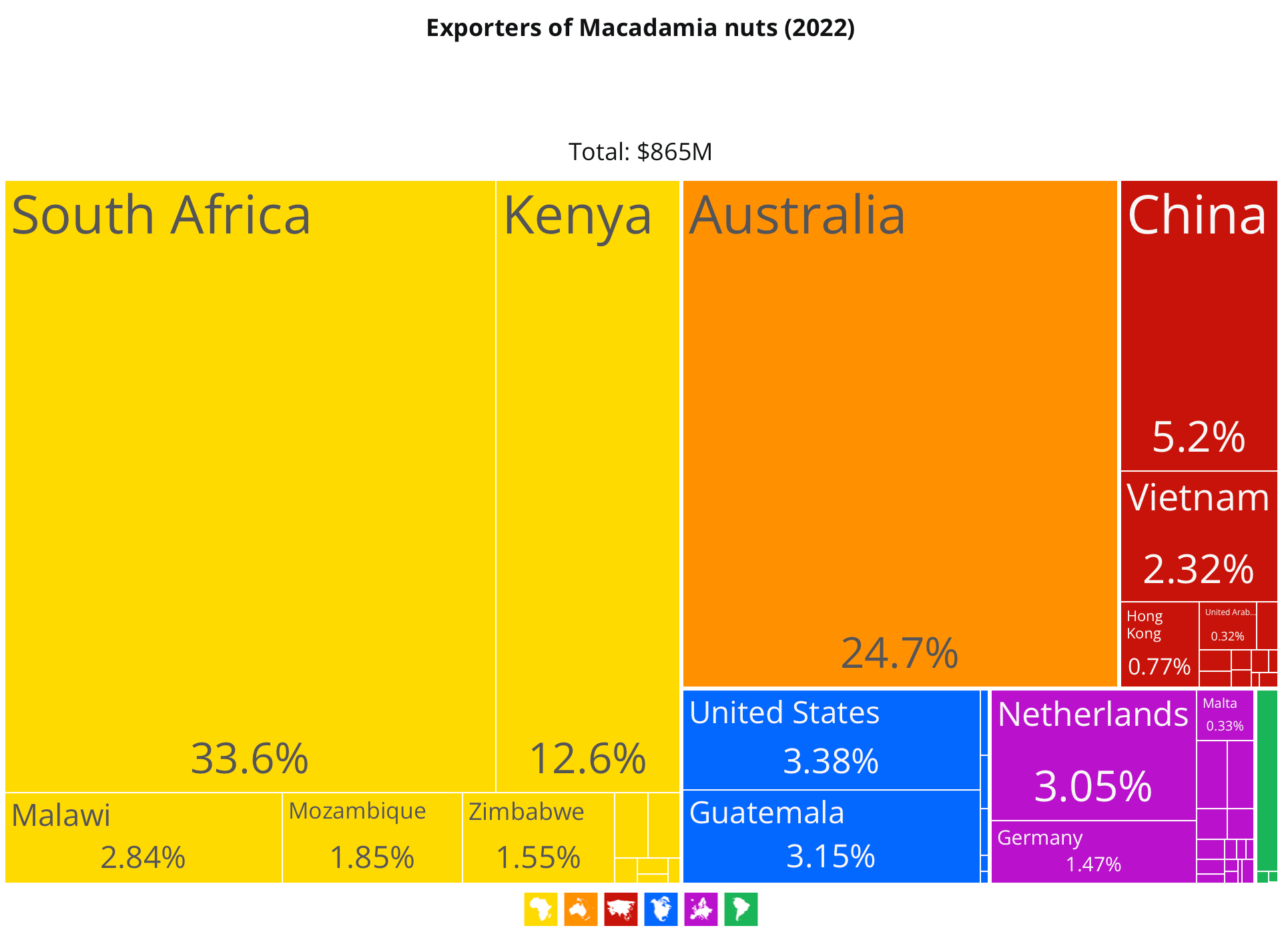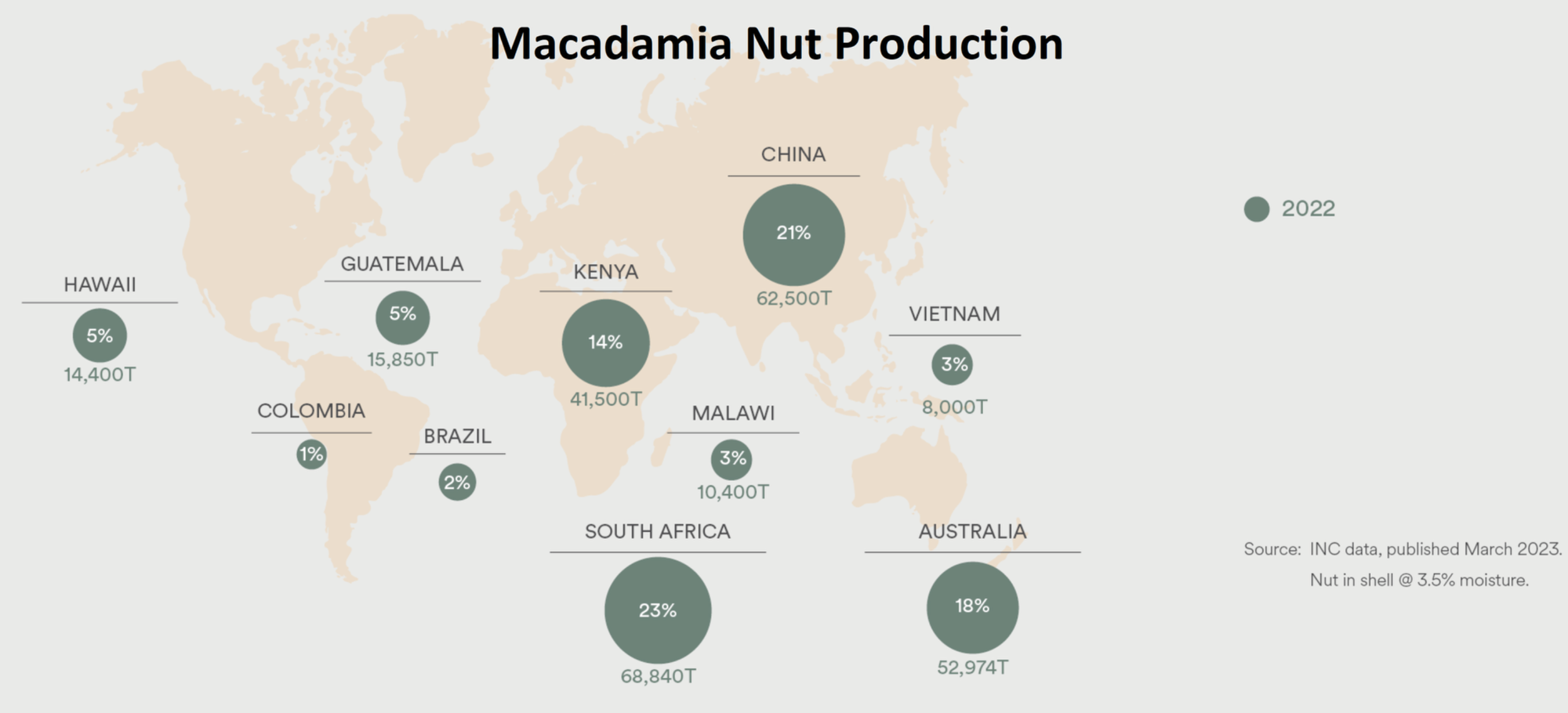 2022年,澳洲坚果的产量全球排名前三位的分别为南非、澳大利亚和肯尼亚;而非洲各国的产量则占据了世界总产量的40%。南非、澳大利亚和肯尼亚同时也是澳洲坚果仁的出口的前三位。而中国、美国和欧盟则是澳洲坚果仁的最大进口国。