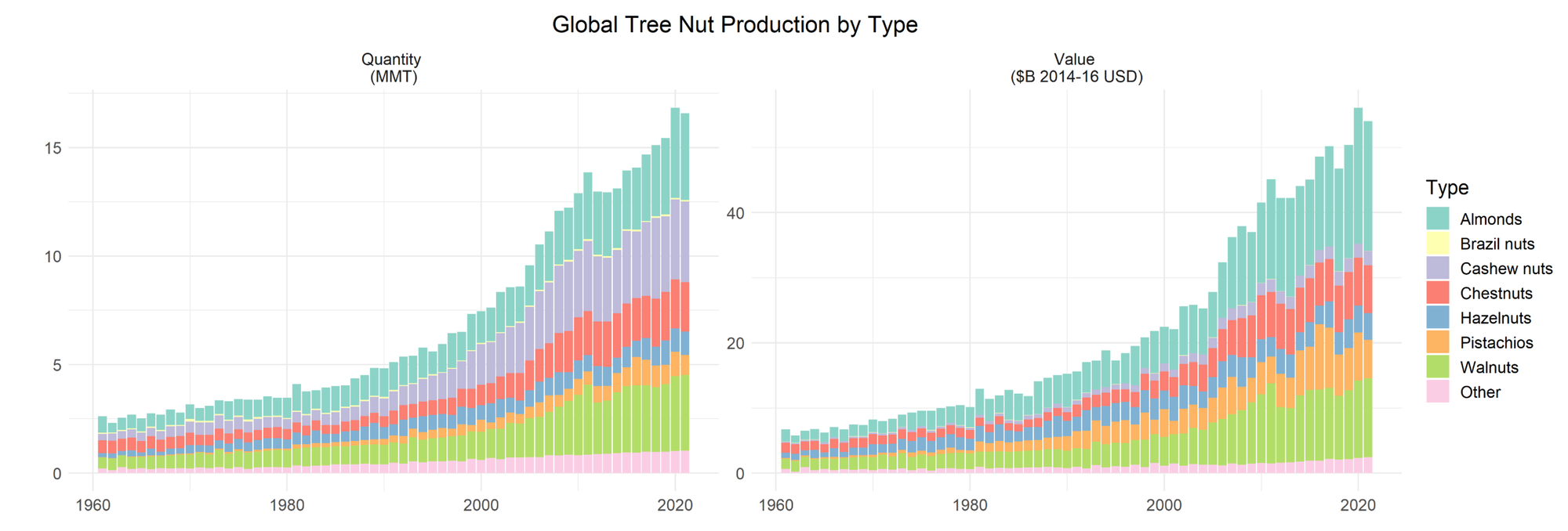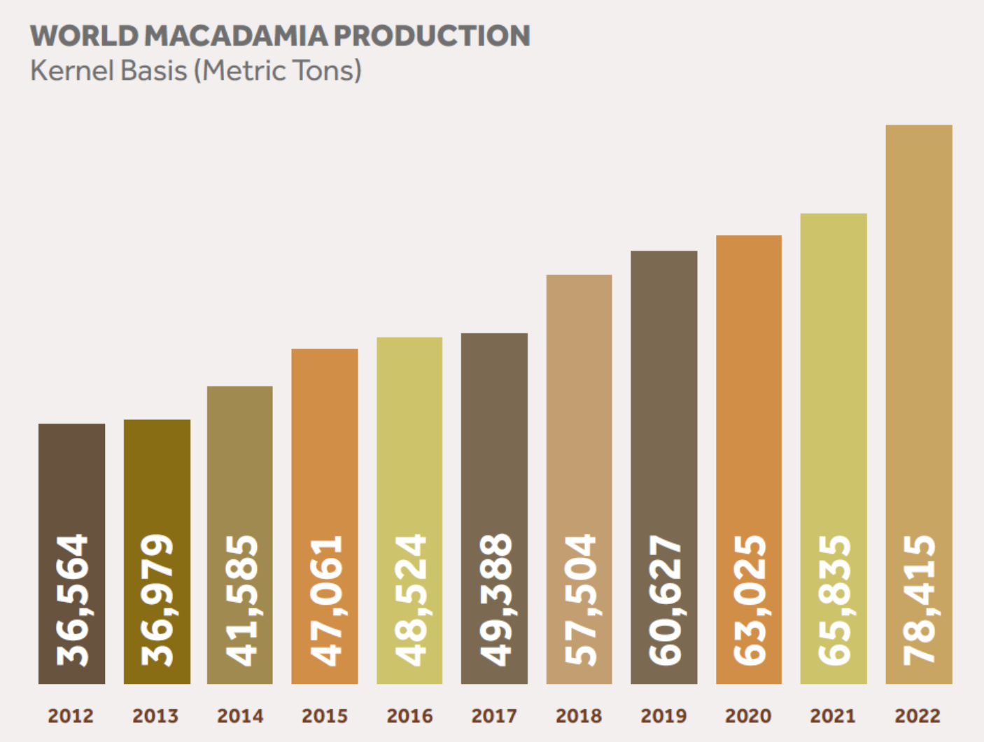 全球坚果产量和市值柱状图(左)、比例图(中),其中澳洲坚果所占比例非常小;自2012年以来,澳洲坚果的产量已增长一倍以上(右)