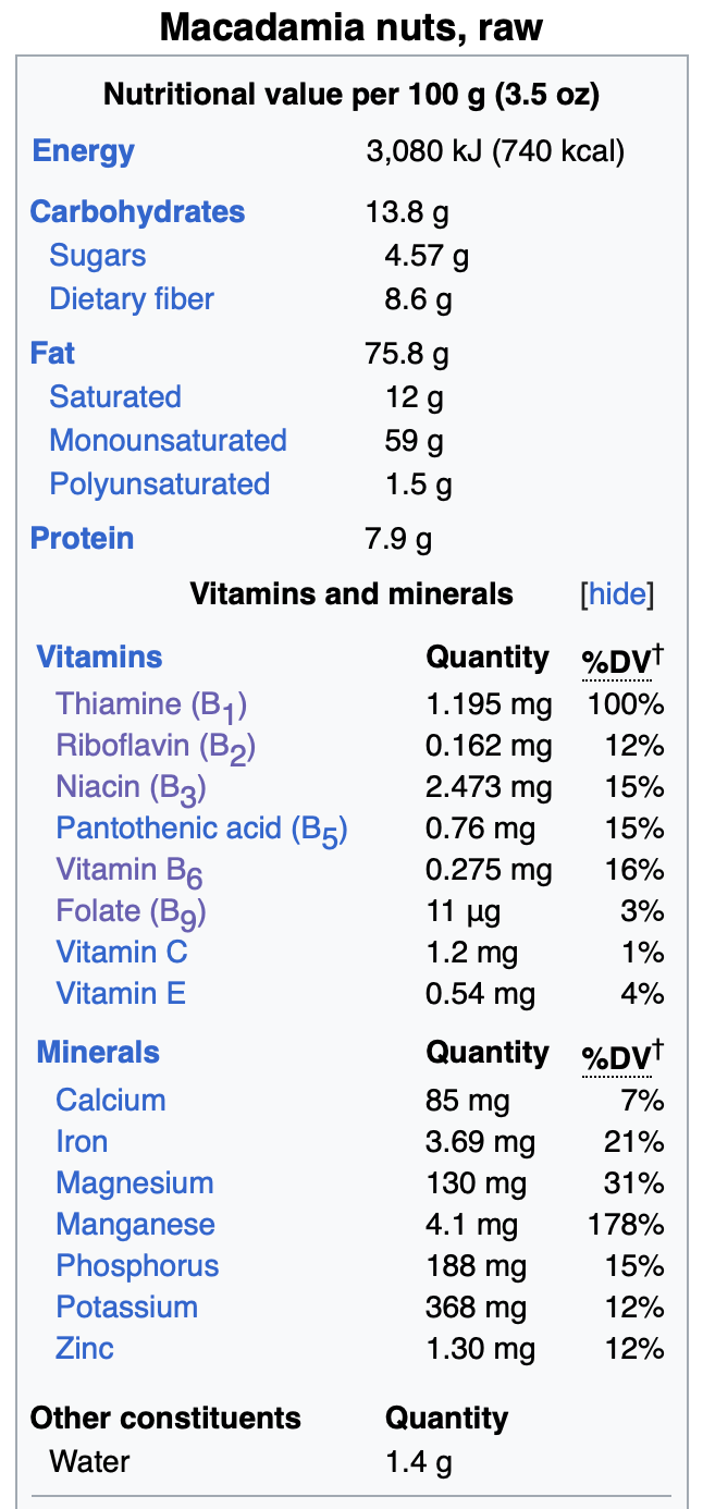 澳洲坚果含有1%的水、14%的碳水化合物、76%的脂肪和8%的蛋白质。其营养丰富,富含膳食纤维、蛋白质、锰、铁、铜、镁、硒、磷、维生素B1(硫胺素)、维生素B6。与其他常见的食用坚果(如杏仁和腰果)相比,澳洲坚果的单不饱和脂肪(MUFA,monounsaturated fatty acid)含量最高(占总含量的59%),而棕榈油酸(Omega-7 palmitoleic acid)就占总脂肪的17% 。