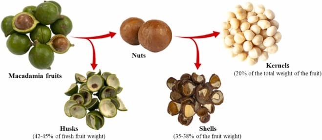 澳洲坚果的种子壳非常坚硬,需约2000牛顿的力才能破开——硬度是榛子壳的五倍,其机械性能与铝相似,维氏硬度为35。乳白色的球形种仁就是澳洲坚果可食用的部分。