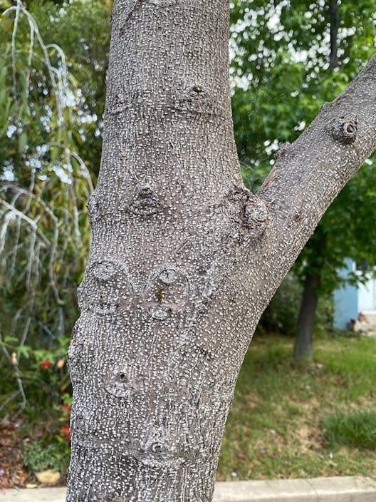 澳洲坚果植株高5-15m,树干强壮且直立,树皮呈现褐色、浅褐色、深褐色(上);叶革质,轮生,每轮3-6片,长圆形、倒卵形或椭圆形,长约6-30cm,宽约3-13cm,叶缘为全缘(右)或具刺状锯齿(左),侧脉7-12对,叶柄长4-15mm