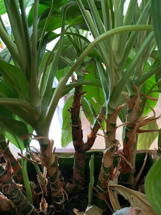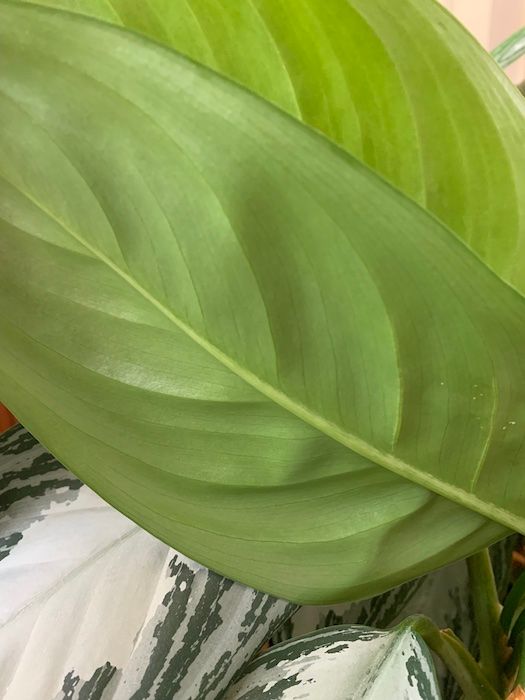 茎干粗壮(偶见肉质),粗约1.5-2.5cm,节间长2-4cm,株高可达1.5m;叶片大而光亮,着生于茎干上部,椭圆状卵圆形或宽披针形,先端渐尖,全缘,长20-50cm、宽5-15cm;叶片两面深绿色,正面常镶嵌密集而不规则的乳白或淡黄色斑纹;叶鞘近中部下具叶柄,主要叶脉在叶背面隆起。