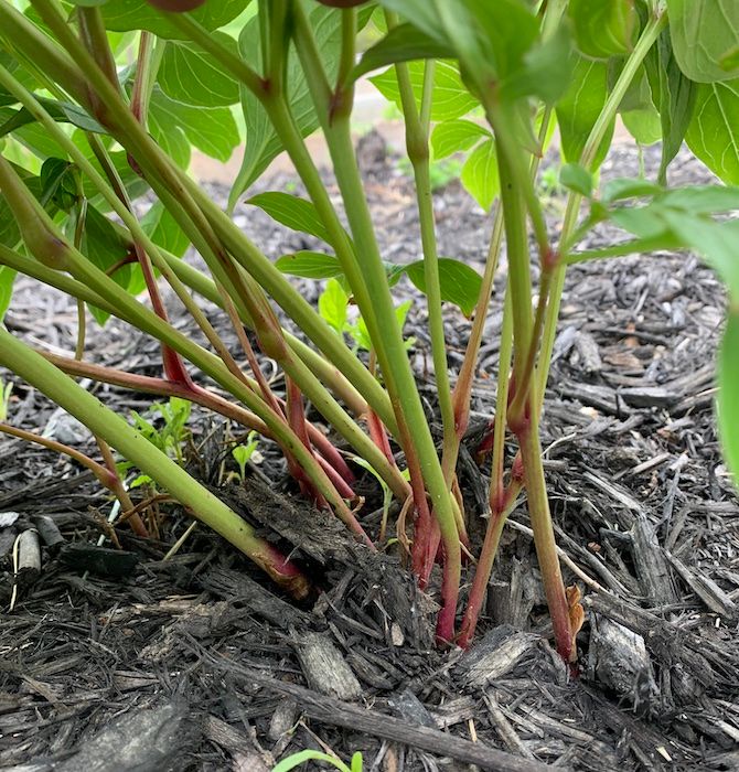 芍药与牡丹的主要区别之一就是茎:芍药是草本,茎很软,常常支撑不住硕大的花朵而倒伏,需要用木棍或细竹竿辅助支撑,冬天则似草样枯萎,地面部分完全消失;牡丹则是木本,茎似一般灌木,无须辅助支撑,冬天仍留于地面。