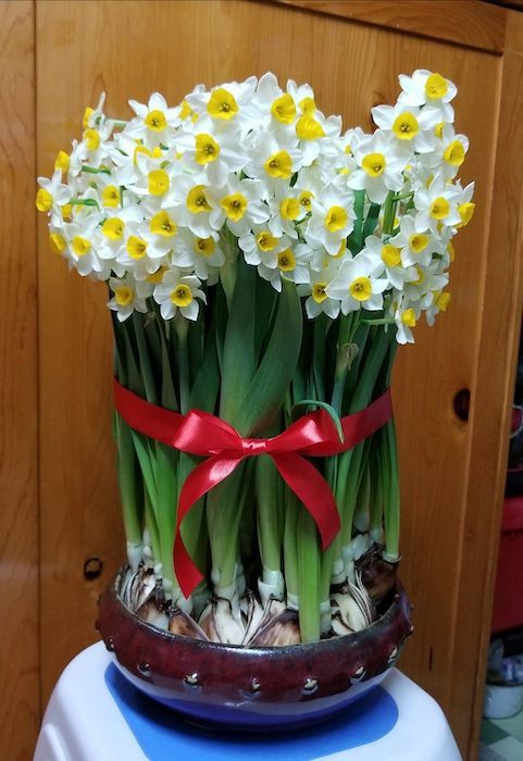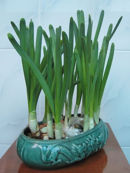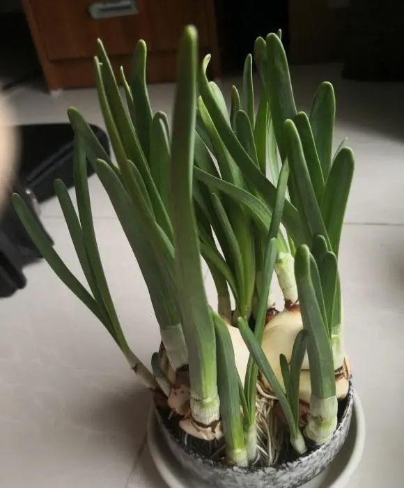 水仙开花后,碧绿的叶子,一簇簇白色小花,嫩黄色的花心,煞是好看。再用红纸剪成两三指宽的纸带,把长条绿叶拢一拢、扎一扎,过年的气氛就来了。也有时候水仙碧绿碧绿倒是茂盛,却没有花葶,主人就自嘲自己种了棵“大蒜”,哈哈一笑,也是开心。