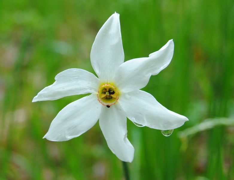 - 红口水仙组(Poeticus)——花瓣纯白;副冠矮,高度不超过花瓣1/5,带红色镶边,副冠中心常绿色或红色;花药明显分为高低两组;花常芬芳。
